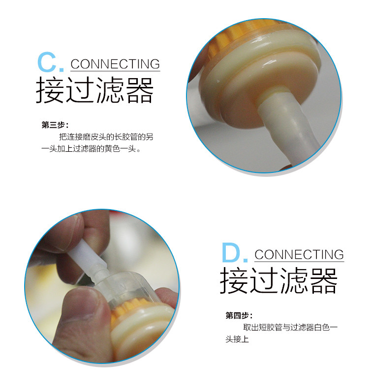 3. फिल्टर के पीले अंत में अपघर्षक टिप को जोड़ने वाली लंबी नली के दूसरे छोर को जोड़ें